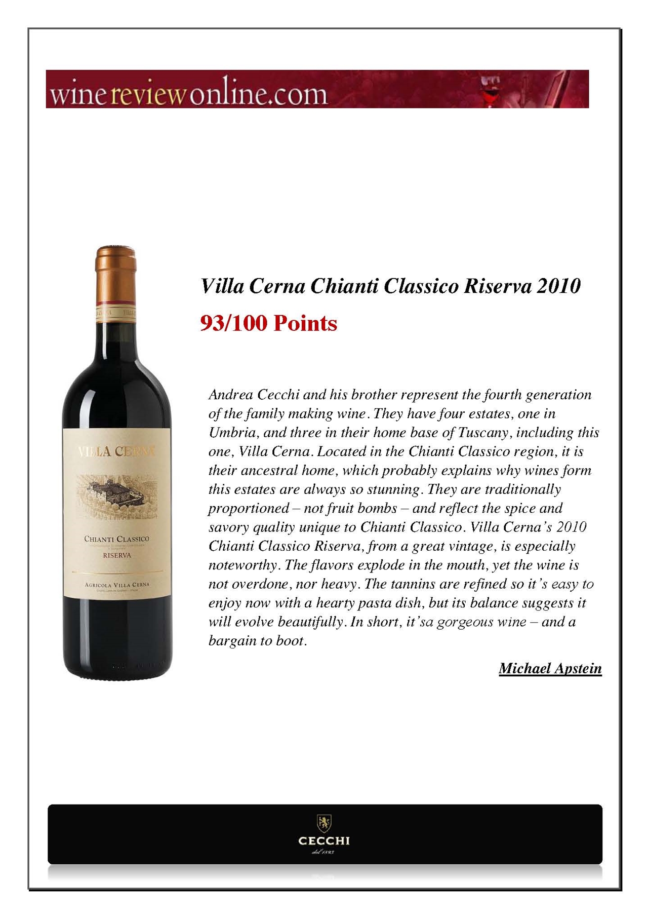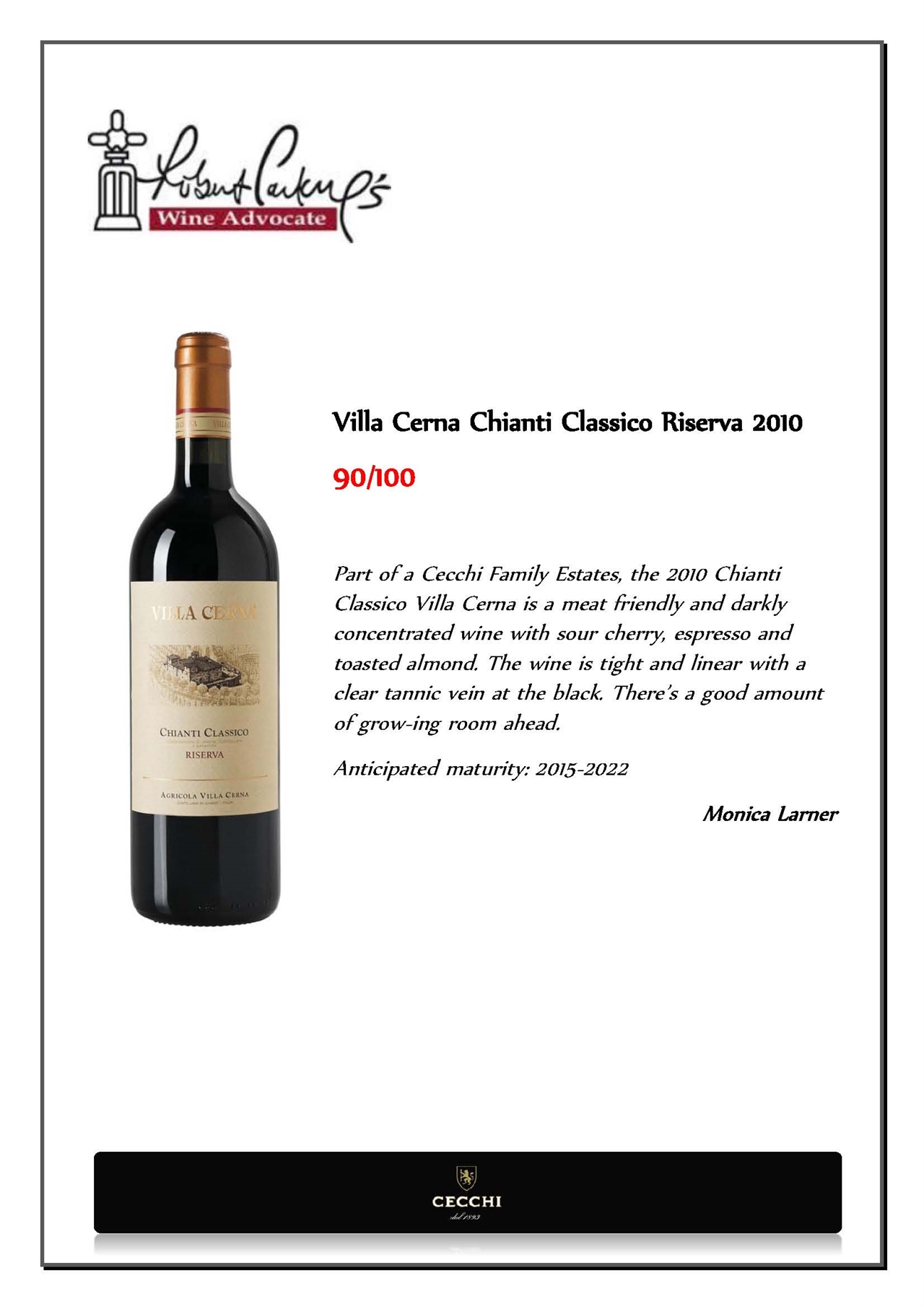 Villa Cerna Chianti Classico DOCG 2014 Bottle: $79.00 Clear ruby color, intense floral bouquet, violet and iris aromas. Tannins and freshness of fruit. ITALY WINES RED Villa Cerna Chianti Classico DOCG Riserva 2012 1500ml: $229.00 Round, full-bodied and balanced with a spicy finish of cola and ripe berries. ITALY Bottle: $119.00 ... Retrieve Document
